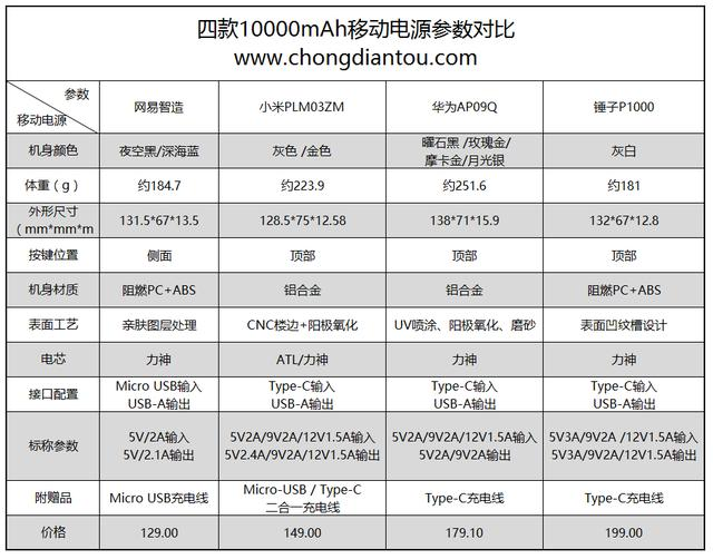 这是一张融合上述四款移动电源基本参数的表格。从官方提供的参数来看,锤子、网易智造的电芯来自优质电芯供应商力神;小米PLM03ZM因生产批次不同,电芯有ATL和力神两个品牌;而华为官方并未明确说明AP09Q电芯品牌,但从华为移动电源快充版AP09Q拆解评测中得知其电芯品牌也是ATL。